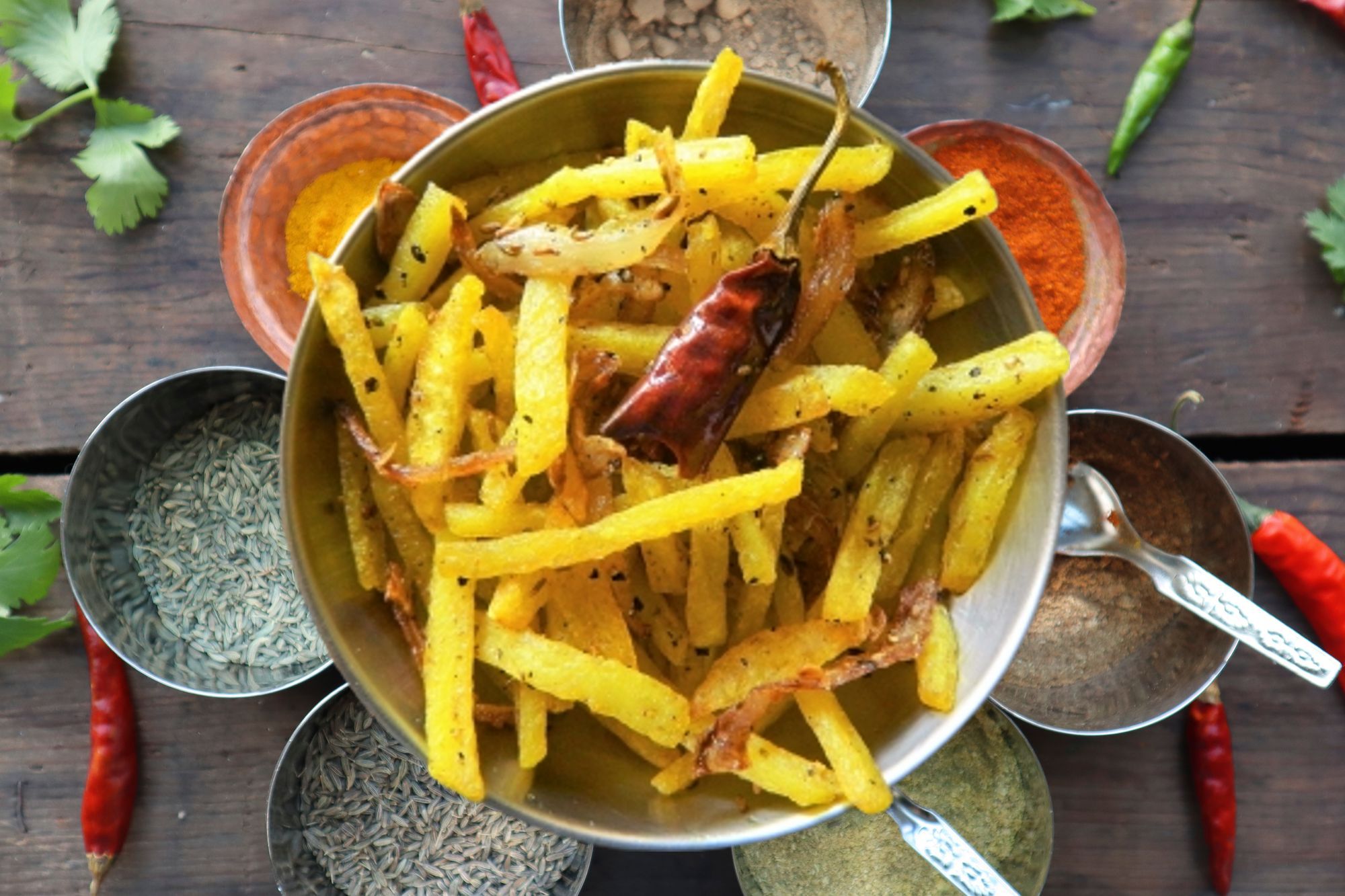 Indian spice-rubbed potatoes and onion cooked Bengali-style until golden and soft. A perfect combination with rice and dal, or with roti.