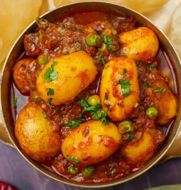 Indian-Style Curried new-potatoes cooked in a savoury, tangy sauce,and sprinkled with green Peas.