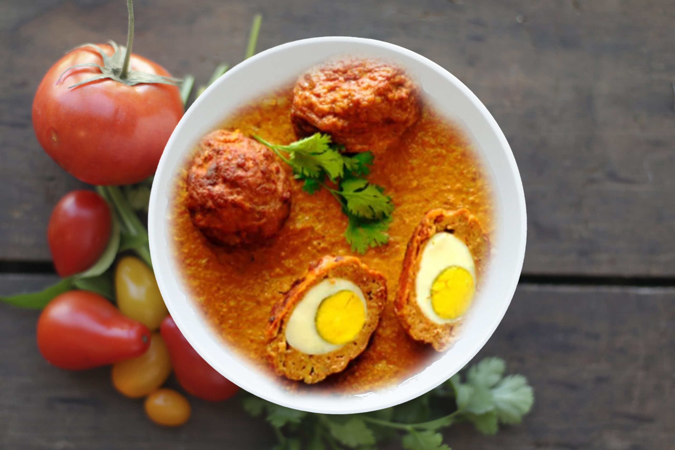 Koftas meatballs are found in the subcontinent, South Caucasian, Middle Eastern, Balkan, and Central Asian cuisine. Nargisi Koftas consist of balls of ground chicken mixed with spices and onions with boiled eggs as a core. Koftas split in half to represent Nargis flower. Served slathered with special succulent curry of distinctive aroma.