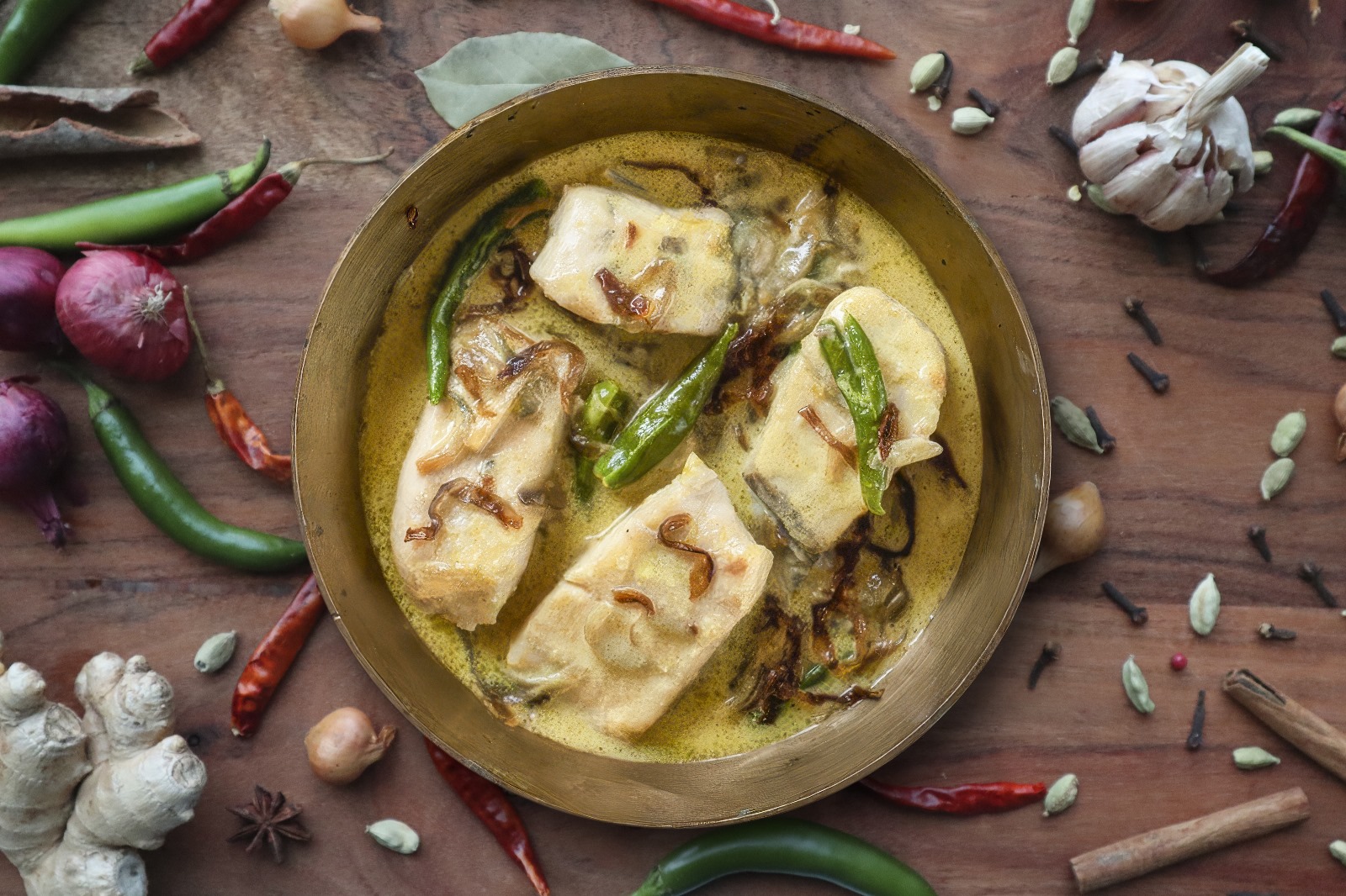 Narkel Swai, Swai slices cooked in coconut milk perfumed with ginger and caramelized onions. No spices whatsoever. Barring those one-off wicked chilies.