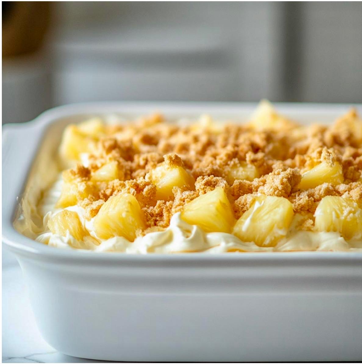 Pineapple Delight that is outrageously delicious, rich, and decadent. Pineapple is always refreshing and when you combine it with whipped cream. This dessert includes a buttery graham cracker crust & pineapple pieces followed by a creamy layer, then topped with the dreamiest pineapple whipped topping & chocolate syrup